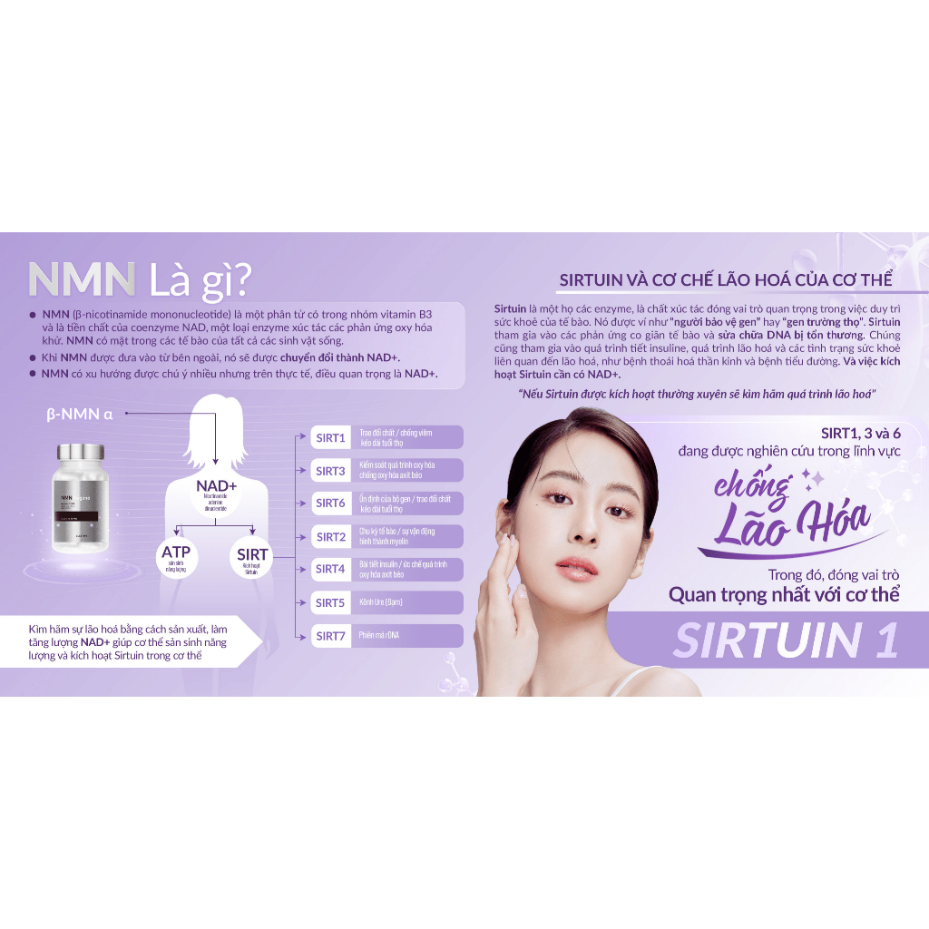 🔶 THÀNH PHẦN VÀ CÔNG DỤNG : – β-nicotinamide mononucleotide 320mg – Năng lượng 2,11kcal – Protein 0g – Lipid 0,018 g – Carbohydrate 0,49g – Tương đương muối 0,0002g – NMN làm giảm sự lão hóa của cơ, xương, gan, thị giác, tăng miễn dịch cho cơ thể – Việc duy trì viên viên uống trẻ hóa da NMN là cách kéo dài thanh xuân hiệu quả nhất – NMN như là 1 dòng thực phẩm chức năng của Nhật giúp chống lão hóa làn da, giúp da căng bóng, giảm nếp nhăn – Da hồng hào, sáng mịn đầy sức sống – Hạn chế nám, tàn nhang, đồi mồi hay sạm màu xuất hiện bất chấp tuổi tác – Giảm hiện tượng mọc mụn, da khô, thô ráp, sần sùi – Giấc ngủ tốt hơn, ổn định tâm trạng, suy nghĩ nhạy bén hơn và cảm giác khỏe mạnh tổng thể. – Tốt cho sức khỏe: Phòng ngừa các bệnh tim mạch, cao huyết áp, đột quỵ,… – Viên uống nmn 200mg giúp tăng cường trí nhớ, tăng khả năng tập trung Đặc biệt, dòng NMN nội địa Nhật với 99,99% tinh khiết cùng c.ollag.en ở dạng thủy phân thì thực sự phải nói là hiếm có khó tìm, săn cả tháng trời có khi vẫn hụt. Chỉ 2v thôi được ti tỉ công dụng mà bt phải dùng cả chục loại mỹ phẩm, trăm dòng tpcn mới có được.