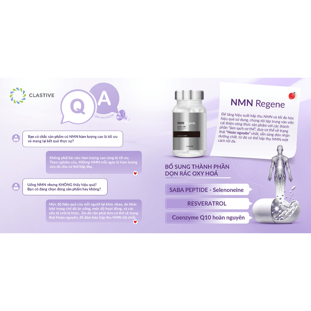 🔶 THÔNG TIN SẢN PHẨM – Viên Uống Trẻ Hóa Da NMN Regene Hoàn Nguyên Nhật Bản, Đảo Ngược Lão Hóa, NMN 12000mg Lượng NAD+ gấp 500 lần vitamin E Tên sản phẩm: NMN Regene Khao khát “trẻ mãi không già”, đẩy lùi bệnh tật mà không biết tới NMN coi như công cốc. NMN không chỉ chống lão hóa, NMN còn là chiến binh truy tìm những g.en lỗi, sửa chữa và cải thiện để bộ máy cơ.thể vận hành tốt hơn. Bởi vậy, những ng có vấn đề về tim mạch, huyết áp, nội tiết khi uống NMN sẽ thấy được cải thiện rõ rệt.